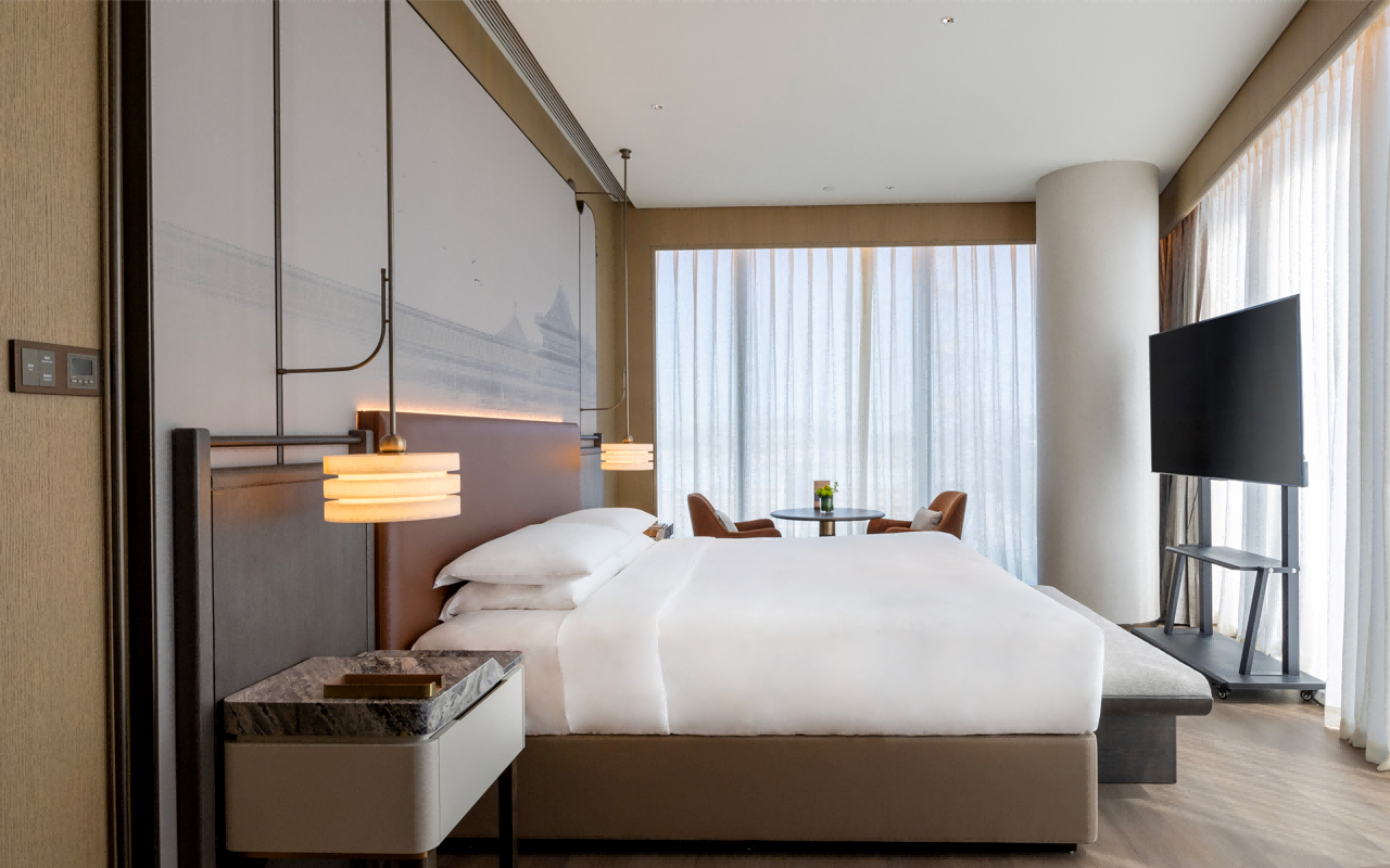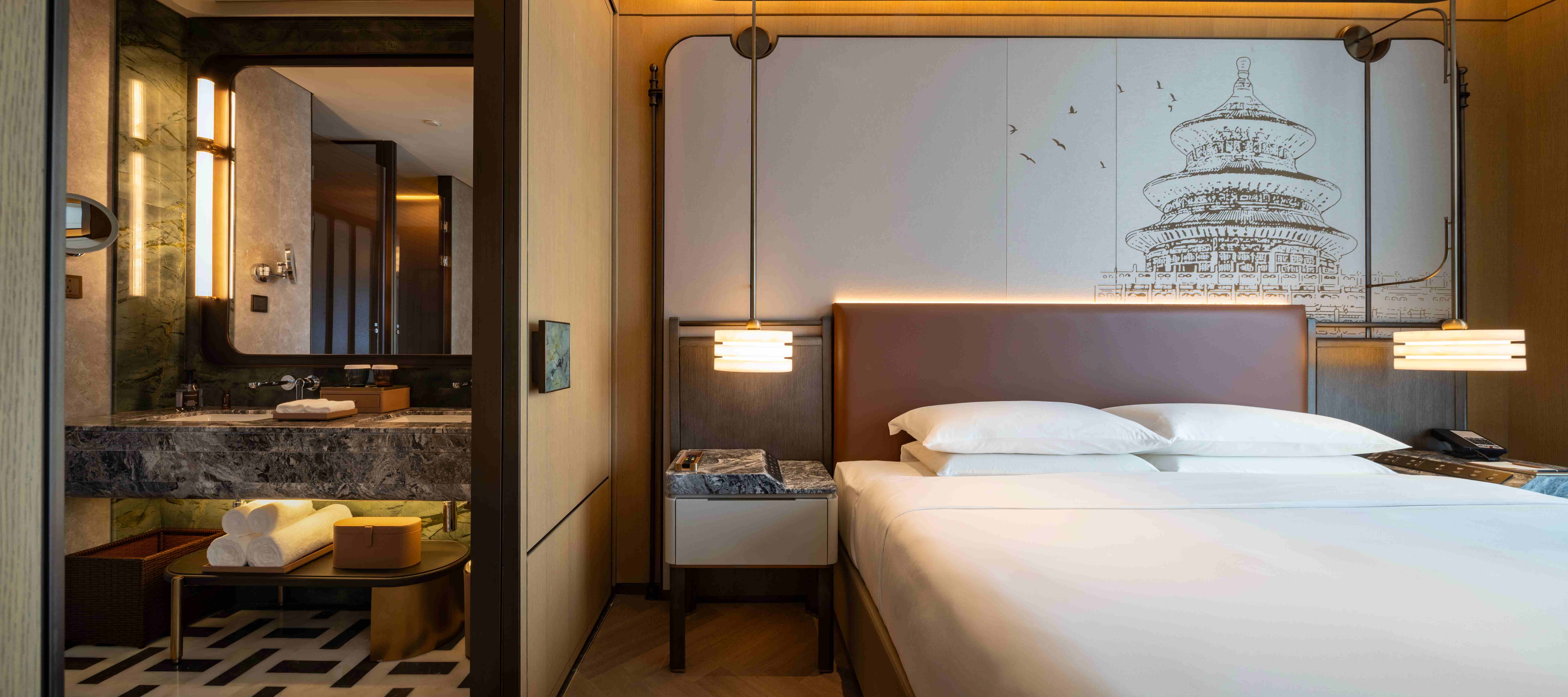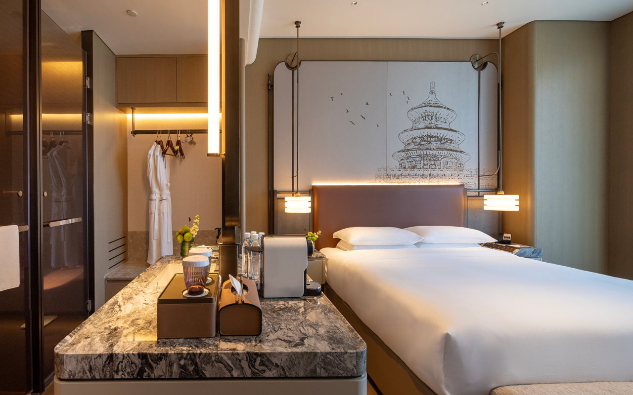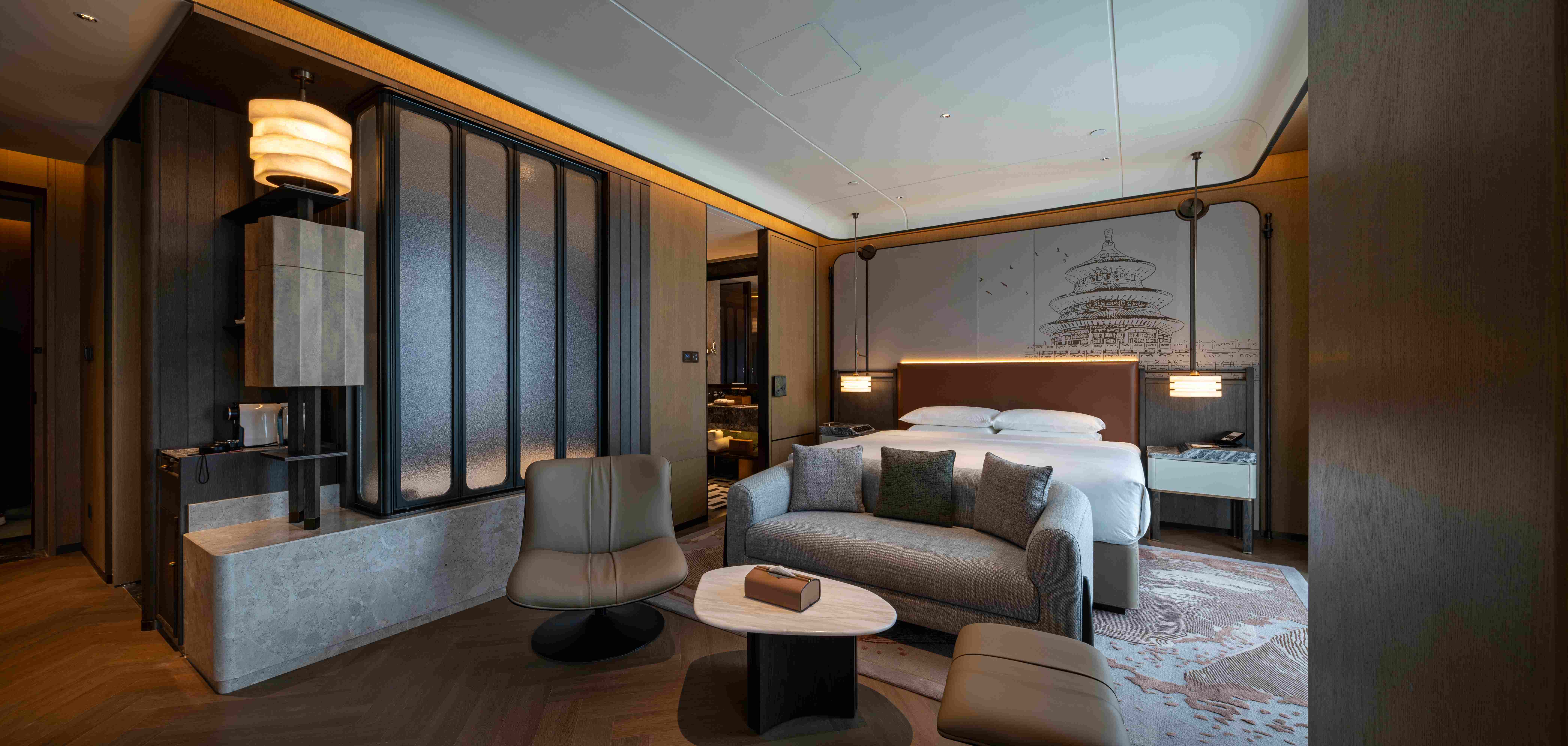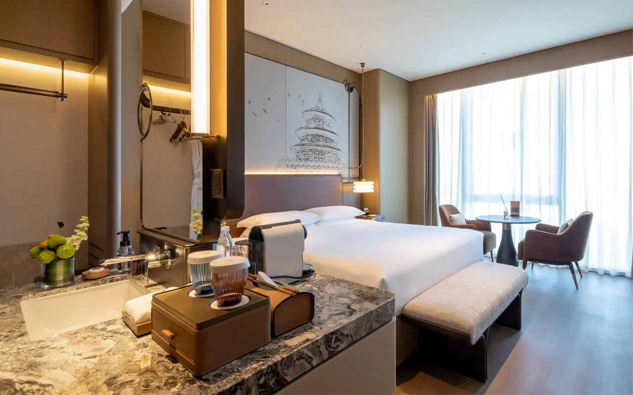 通州遇“建”,好“运”无限 Build Your Luck, Ride the Future in Tongzhou! 北京城市副中心文化旅游区的繁华版图上,建国饭店·环球店静立其间,与北京环球影城的奇幻世界为邻,它深植建国品牌的深厚底蕴,以大运河千年文脉为灵感源泉,用细腻优雅的中式待客之道,编织出一幅精妙绝伦的东方美学画卷。将简约的线条、时尚的格调、轻奢的质感、高效的体验与前沿的科技感完美融合,立志重塑城市美好生活新范式,打造一座生生不息的酒店文化综合体。 这座匠心之作,在2025GBE酒店设计大奖中脱颖而出,一举斩获“最佳城市地标酒店奖”。建筑设计巧妙融合现代与传统元素,于都市喧嚣中辟出一方文化、舒适与优雅兼具的“都市绿洲”,更为通州增添了一座熠熠生辉的标志性建筑。